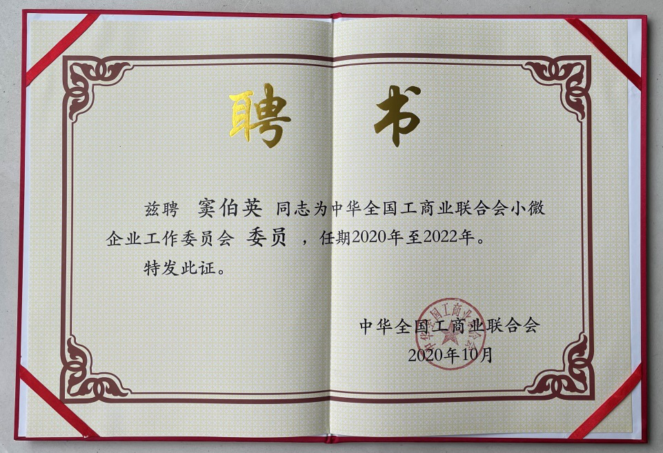 为进一步落实新时代民营经济统战工作的要求,有效扩大统战工作覆盖面,加强与小微企业的联系,积极打通小微企业参政议政的通道,推动改善小微企业发展环境,经中华全国工商业联合会(简称:全国工商联)2020年第10次主席办公会议研究,成立全国工商联小微企业工作委员会,并聘请ky开云体育平台(简称:泰斯特公司)CEO窦伯英女士出任中华全国工商业联合会小微企业工作委员会委员。